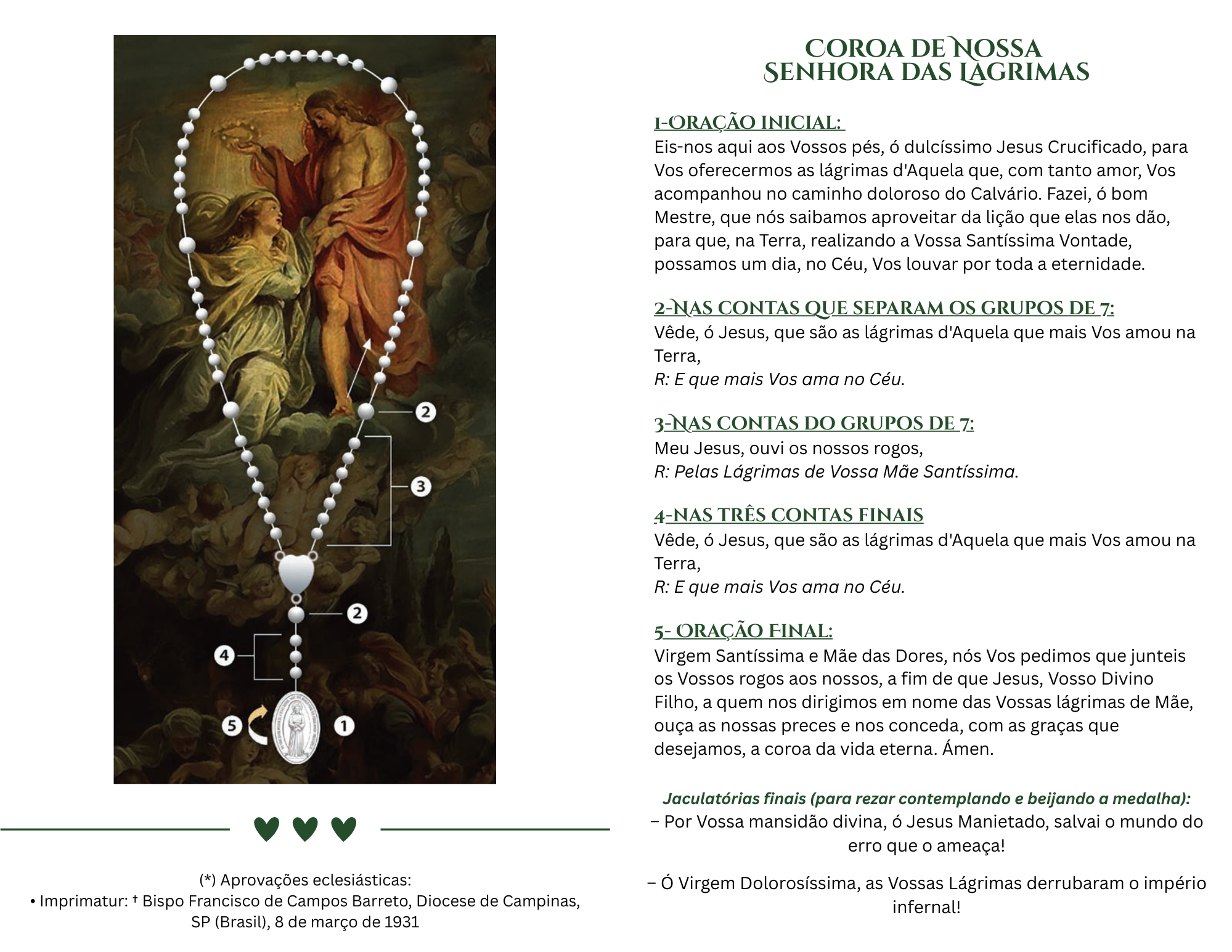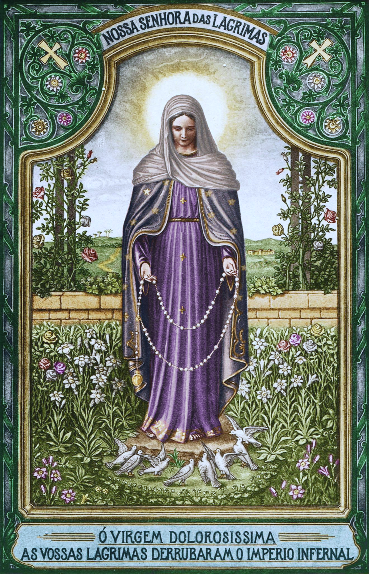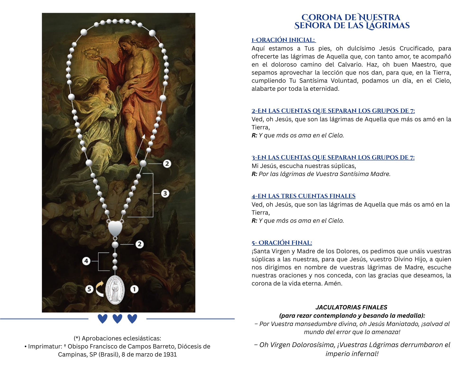 On April 8, 1930, the Virgin Mary appeared again to Sister Amalia and revealed the Medal of Our Lady of Tears and of Jesus Bound (tied during His Passion). She said that this same medal should be widely publicized so that the power of Satan in the world was defeated. Our Lady added that all the faithful people who will bring that prodigious medal with love and devotion would receive innumerable graces. By order of the Mother of God, the front of this new medal depicts Our Lady of Tears handing the Chaplet of Tears to Sister Amalia (just as it had happened during the apparition of March 8, 1930) surrounded by the words: "O Virgin Most Sorrowful, Your Tears have destroyed the infernal empire!". On the back, the prodigious medal depicts the image of Jesus Bound (tied during His Passion) with the following words: "By Your Divine meekness, O Jesus Bound, save the world from the error which threatens it (from http://www.ourladyoftears.com/en/)